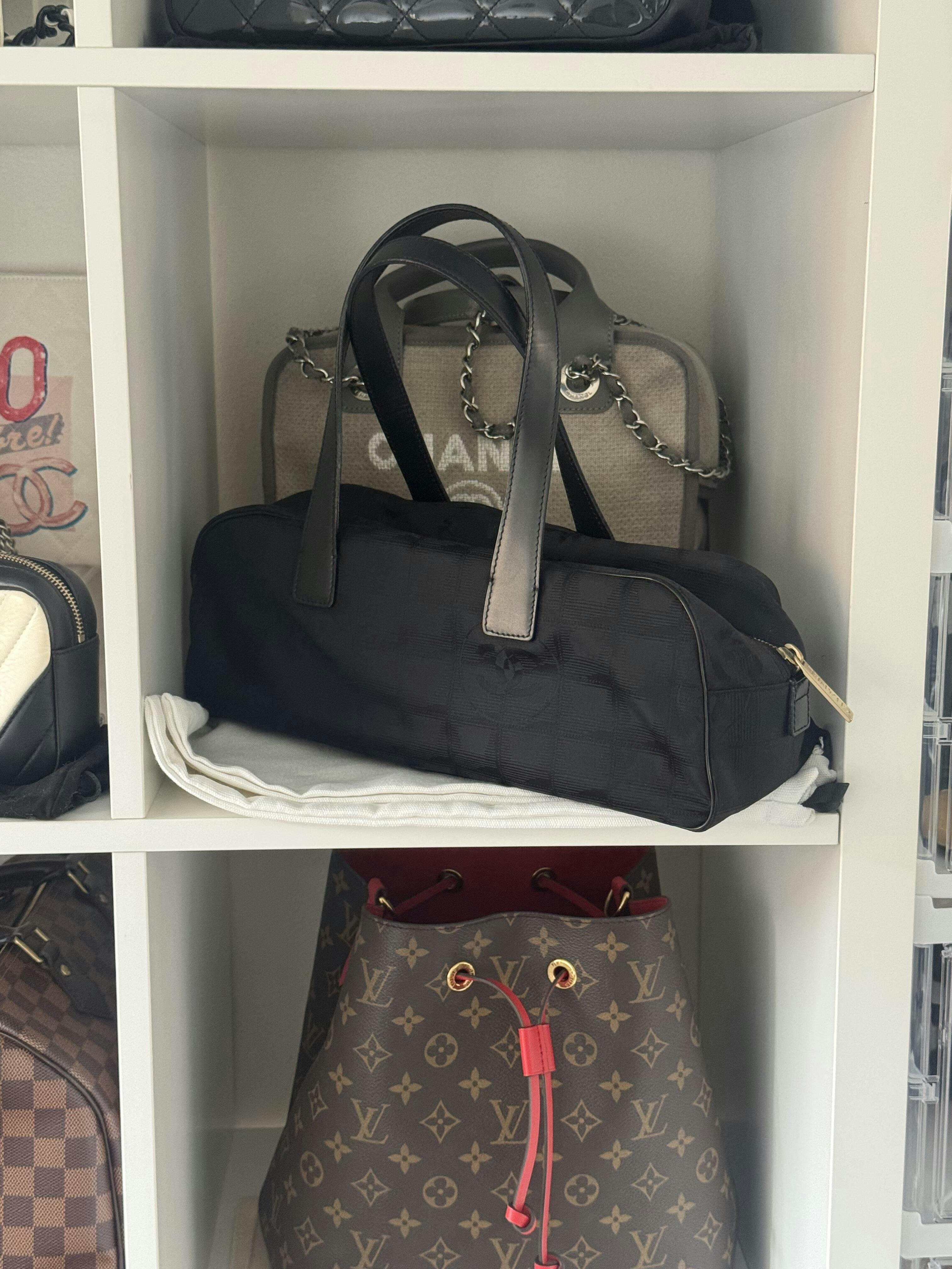 Editor Note: Understated elegance meets everyday functionality with this vintage Chanel Traval Line bag. Crafted from black jacquard nylon with the signature CC logo subtly woven throughout, it’s accented with smooth black leather handles and trim for a timeless finish. The structured, dome-like silhouette offers spacious storage, making it perfect for travel or daily carry. A top zip closure ensures security while maintaining effortless Parisian chic.