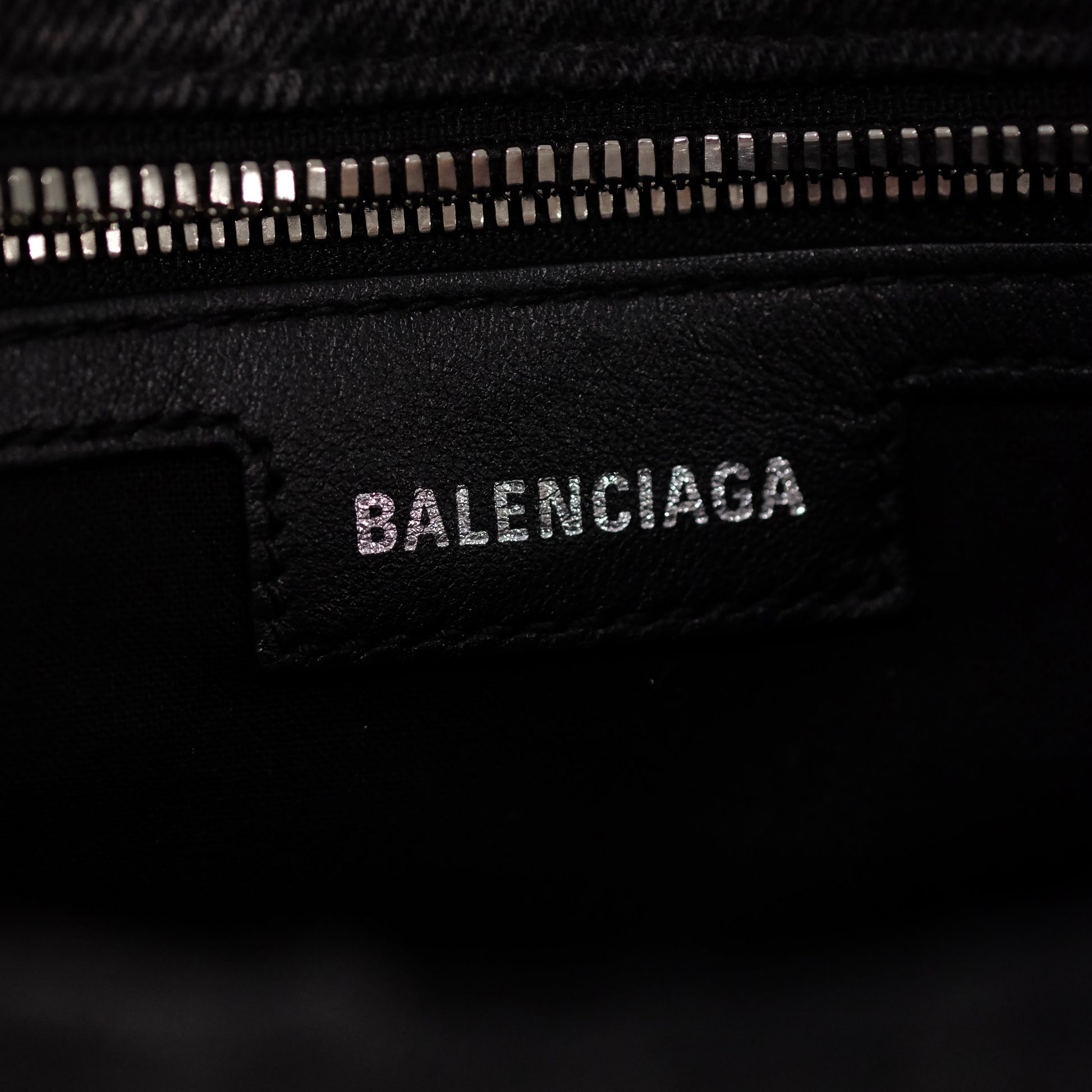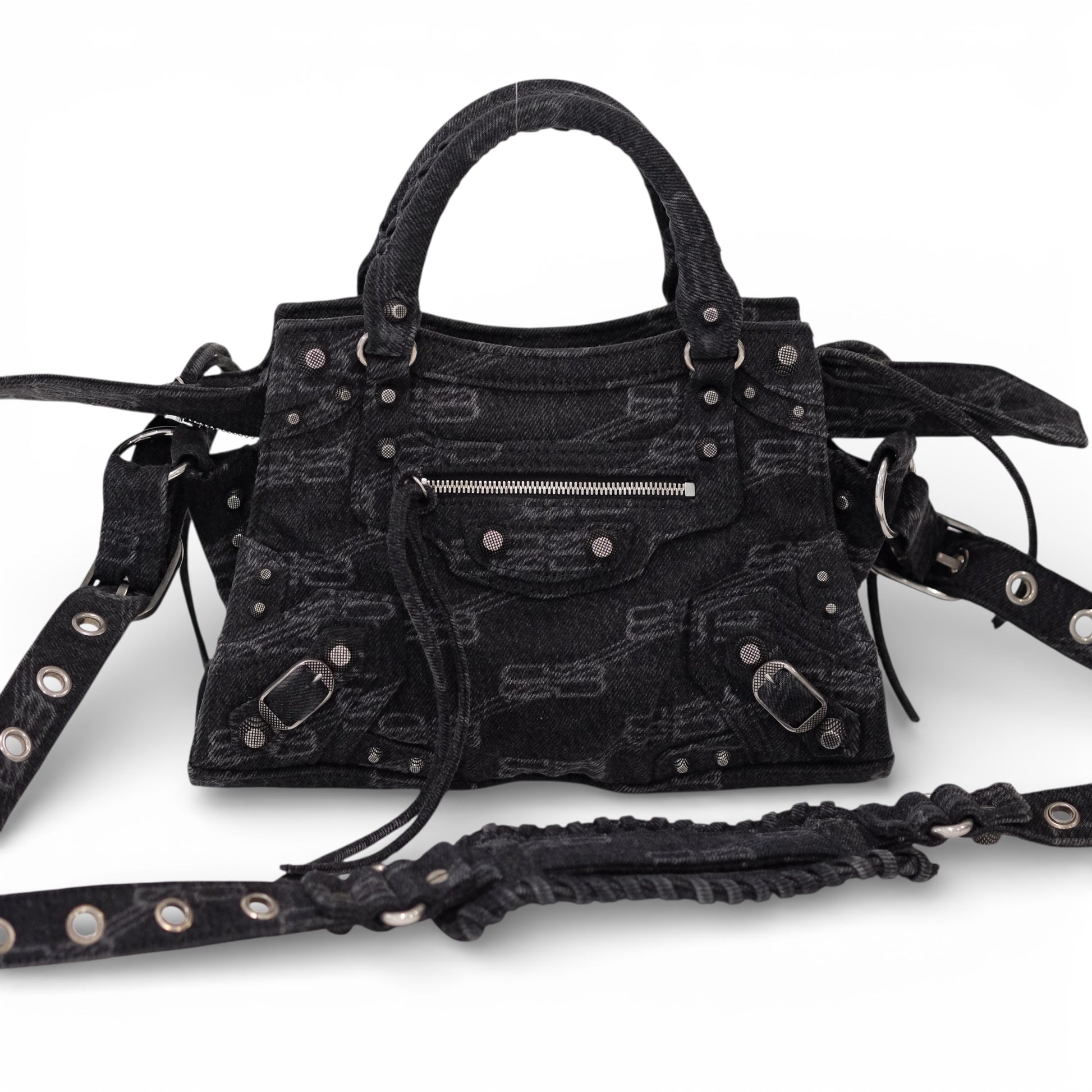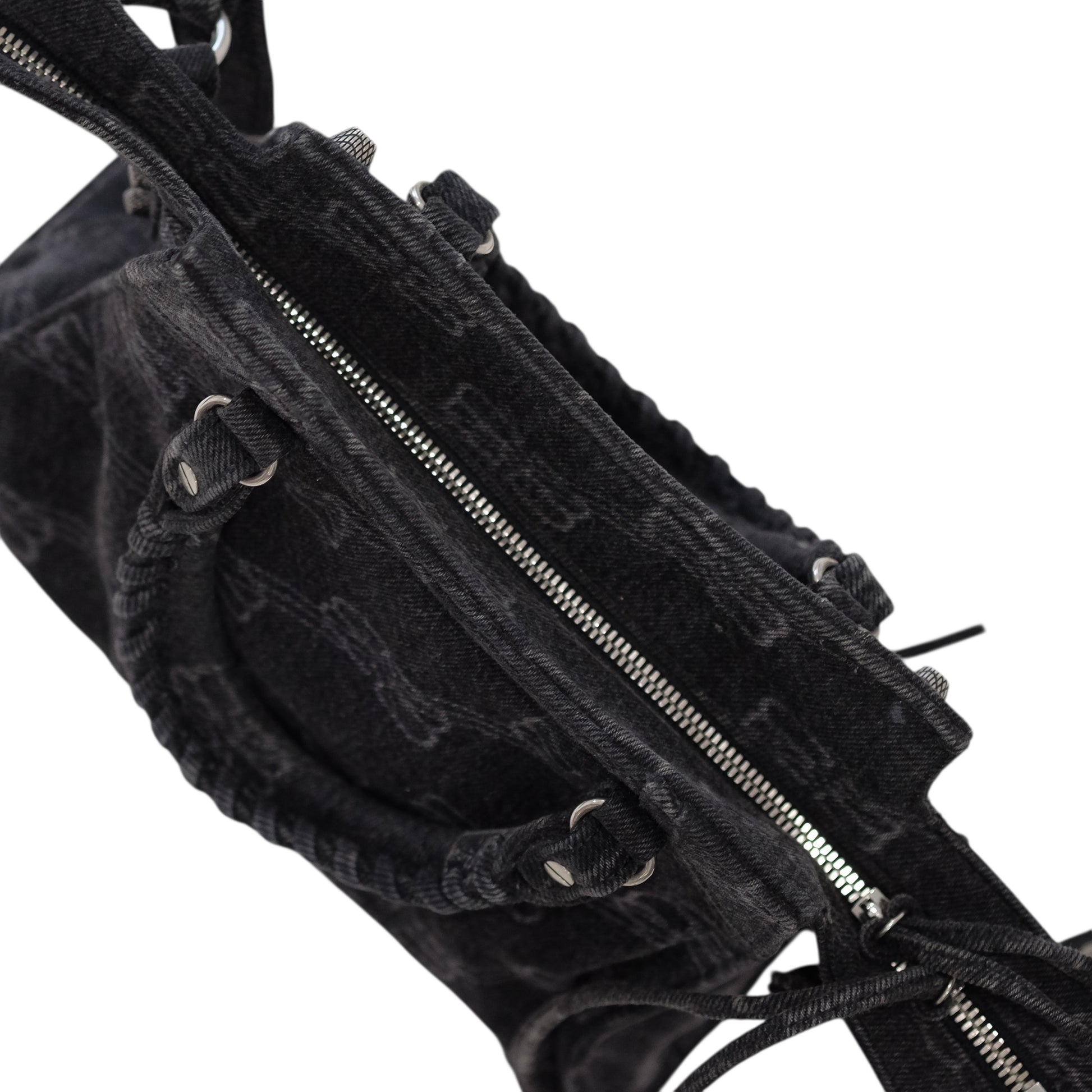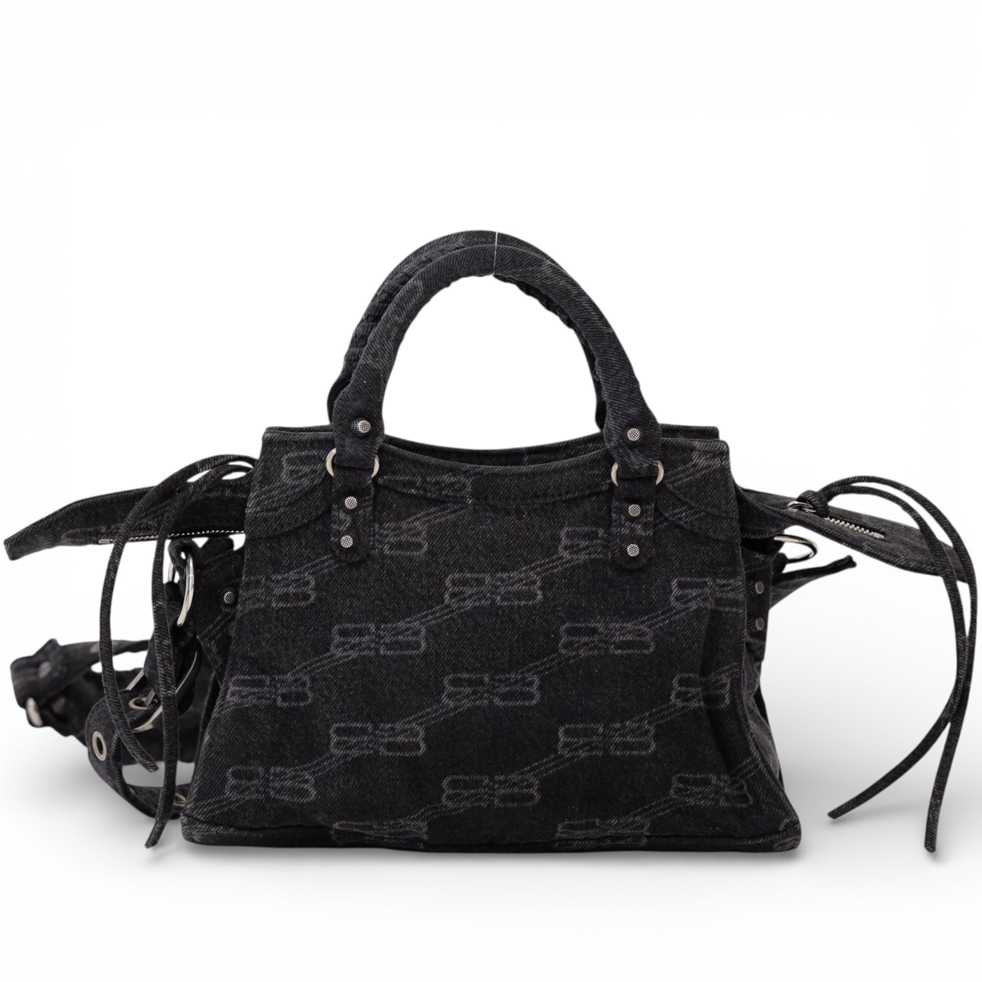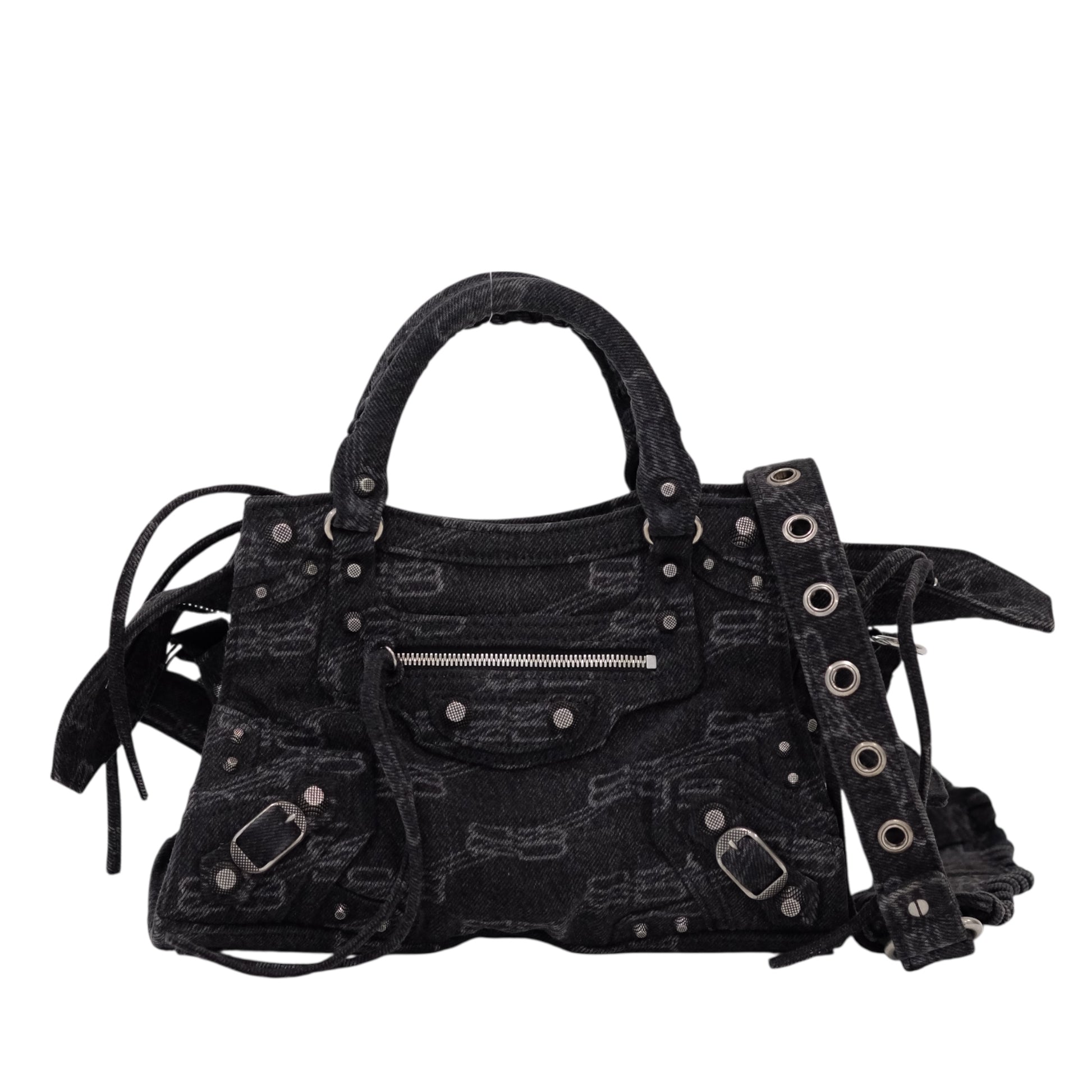 A modern icon with unmistakable edge, this Balenciaga City bag redefines everyday luxury through the house’s signature utilitarian aesthetic. Crafted from black denim jacquard woven with a subtle logo motif, the softly structured silhouette is finished with signature stud detailing, buckle accents, and a front zip pocket. The contrast stitching and aged silver-tone hardware add a distinctly lived-in, effortlessly cool appeal.
