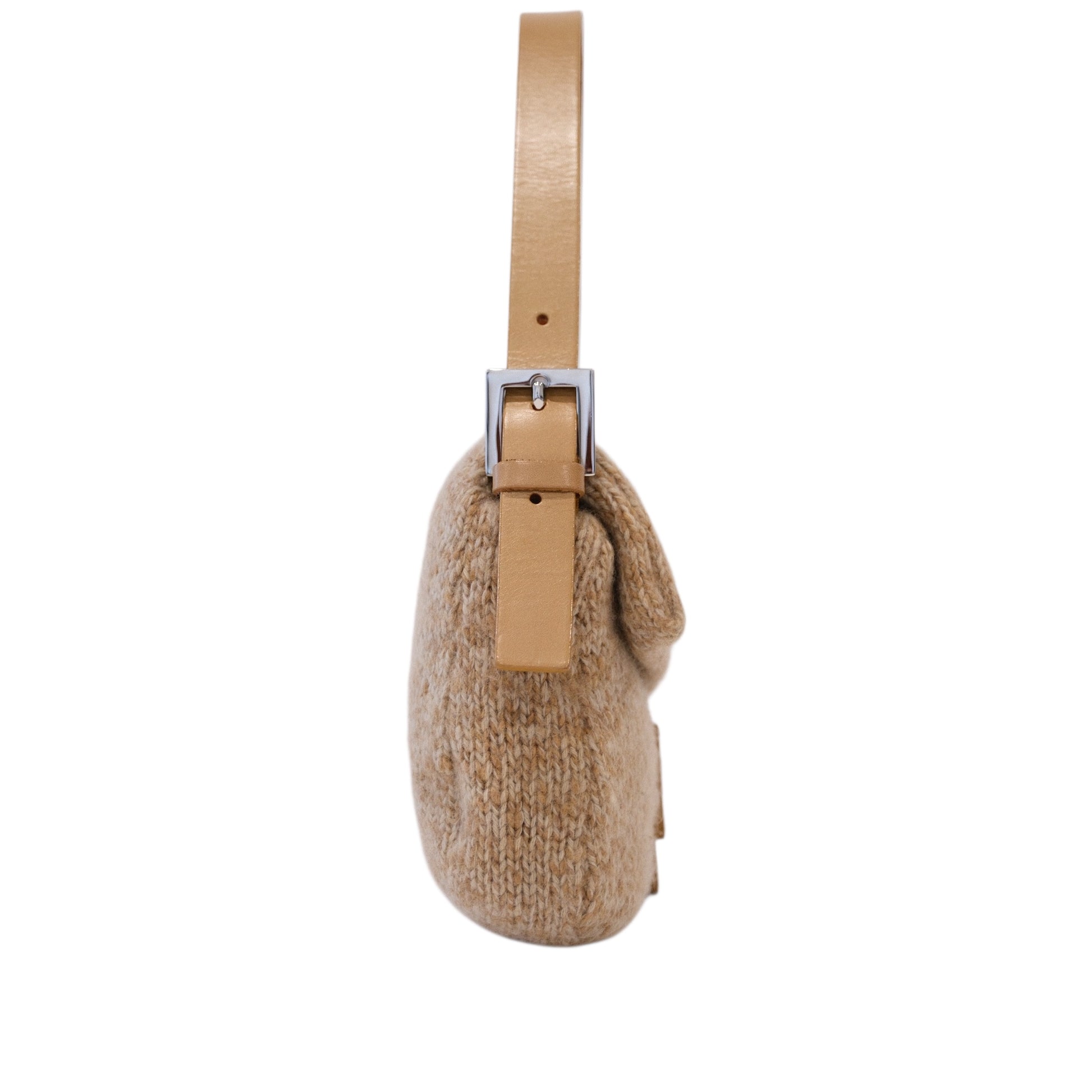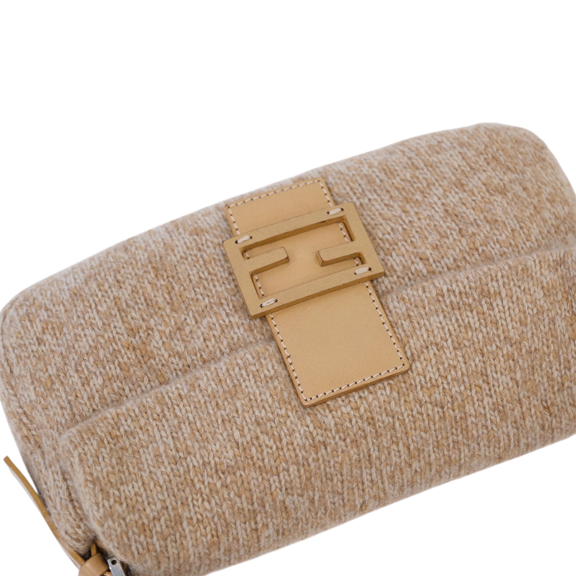 Editor Note: A chic and distinctive Fendi Baguette bag, crafted in a soft, textured beige knit that brings warmth and character to this iconic silhouette. Accented with smooth tan leather trim and the signature FF logo clasp, this piece blends casual elegance with timeless appeal. Effortlessly stylish, it transitions seamlessly from daywear to elevated evening looks, making it a versatile addition to any wardrobe.